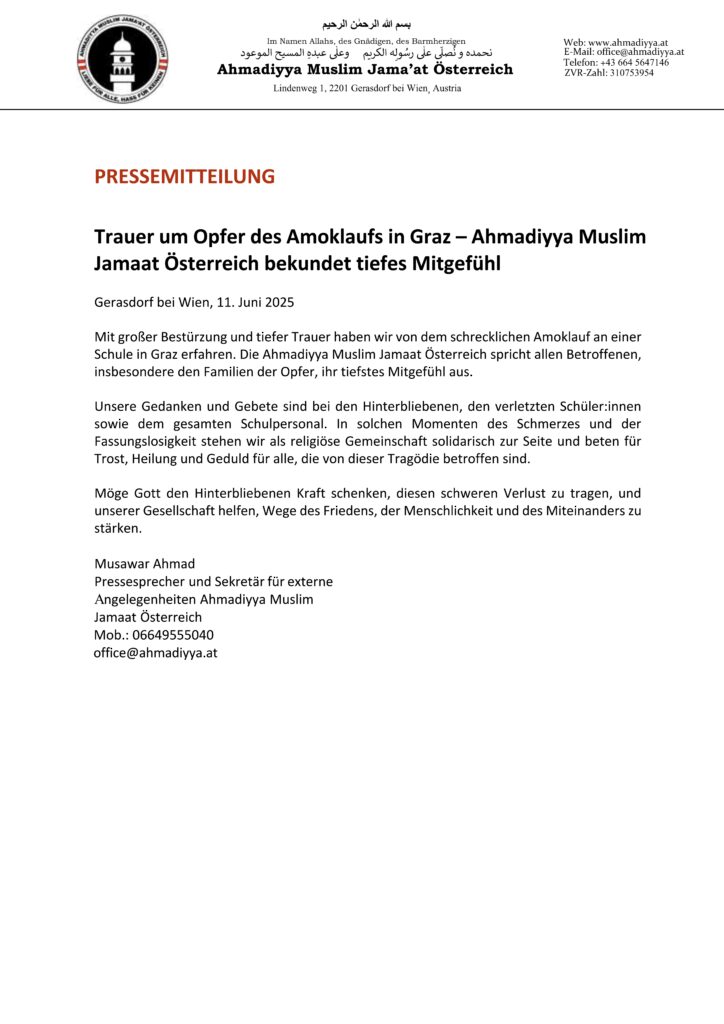 Trauer um Opfer des Amoklaufs in Graz – Ahmadiyya Muslim Jamaat Österreich bekundet tiefes Mitgefühl Al Nasar Ahmed2025-06-14T22:57:00+01:00